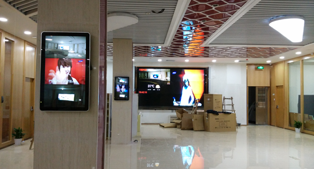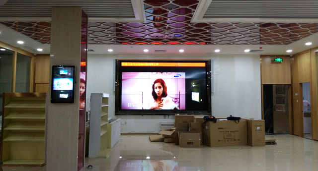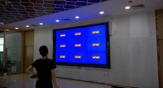 該工程使用的是3.5拼縫55寸低亮3x3的55寸液晶拼接屏和8臺32寸網(wǎng)絡(luò)廣告機。采用墻體凹槽鋁條掛墻活動支架安裝方式,美觀平整,屏與墻合成一體。其它配套設(shè)備:一進16出HDMI分配器和一個網(wǎng)絡(luò)播放盒。