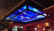 成都北城天街“舌尖自由行”吊頂液晶拼接大屏 “舌尖自由行”餐廳位于四川成都,是一家海鮮自助餐廳,是一家以成都旅行為概...