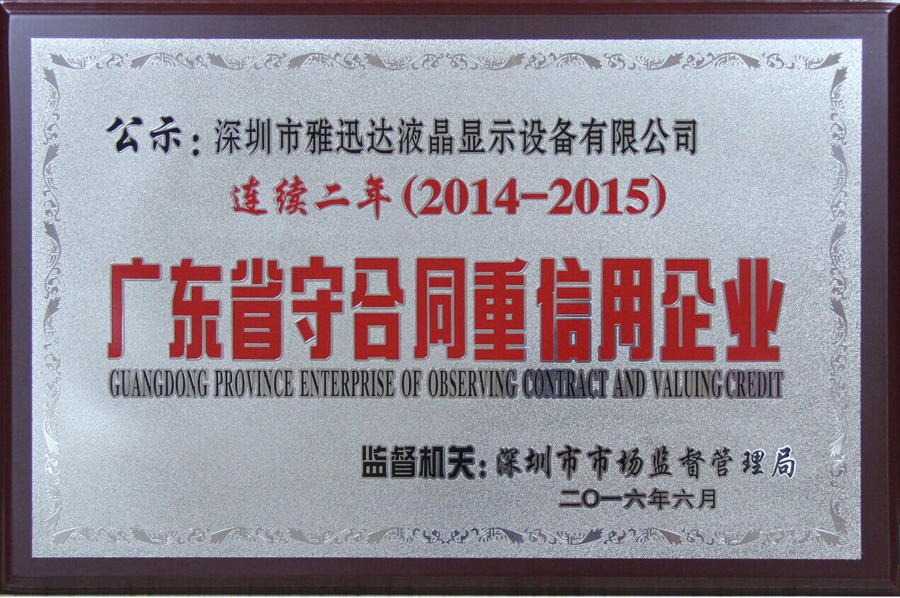 近日,2015年度廣東省守合同重信用企業(yè)授牌儀式圓滿舉行。經(jīng)過廣東省網(wǎng)商協(xié)會的公示推薦,深圳市雅迅達液晶顯示設(shè)備有限公司順利通過廣東省工商局的最終評審,獲得“廣東省守合同重信用企業(yè)”榮譽稱號! 這也是雅迅達二度榮膺“廣東省守合同重信用企業(yè)稱號”。