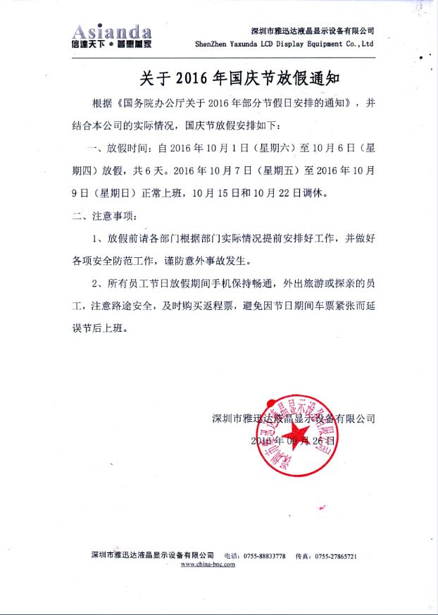 深圳市雅迅達液晶顯示設(shè)備有限公司2016年國慶節(jié)放假通知
