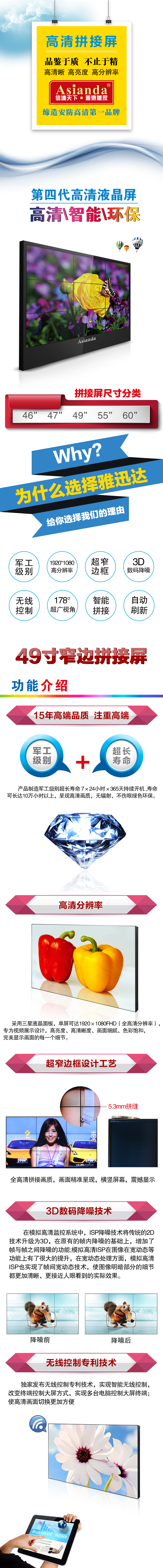 自從DID,PID等液晶屏面世后,安防專家組觀察發(fā)現(xiàn),在2009-2012年間,液晶拼接屏,液晶拼接墻,液晶拼接單元用量猛增,冒出很多家從事液晶拼接屏,液晶拼接墻,液晶拼接單元生產(chǎn)和施工的公司。DID/PID是一種以工業(yè)標(biāo)淮設(shè)計(jì)的,可長(zhǎng)時(shí)間連續(xù)穩(wěn)定工作的液晶屏(一年365天24小時(shí)開(kāi)機(jī)),能適應(yīng)惡劣工作環(huán)境的專用液晶屏。作為其獨(dú)有的顯示技術(shù),與普通液晶顯示器的不同在于其改善了液晶分子排列結(jié)構(gòu),可以橫向、縱向、吊頂放置。具有高亮度、高清晰度(1080P)、使用壽命較長(zhǎng)、運(yùn)行穩(wěn)定和維護(hù)成本低等優(yōu)點(diǎn),并且其色彩飽和度較高(DID可達(dá)93%,而普通液晶屏僅為72%,達(dá)到了更高的對(duì)比度和亮度,以及8萬(wàn)小時(shí)的超長(zhǎng)使用壽命。銳安電子40寸、47寸、46寸高清監(jiān)視器均采用的是DID/PID技術(shù)的液晶屏,再加上一些特有的軟、硬件處理技術(shù),使得高清液晶監(jiān)視器能更加完美地滿足安防工程的需求,能完美地應(yīng)用與環(huán)境惡劣的工程場(chǎng)合。