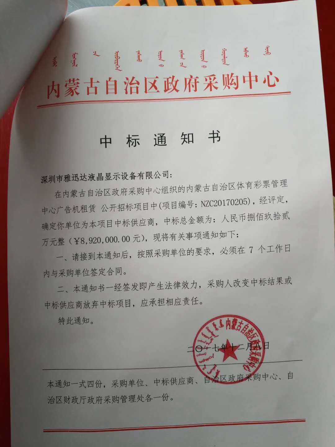 同時在我們歐陽平歐總經(jīng)理的帶領(lǐng)下在內(nèi)蒙古自治區(qū)政府體育彩票管理中心廣告租賃公開招標中,在眾多競爭對手下通過企業(yè)本身的資質(zhì),公司成員不懈的努力成為內(nèi)蒙古自治區(qū)政府體育彩票管理中心廣告租賃項目的供應商