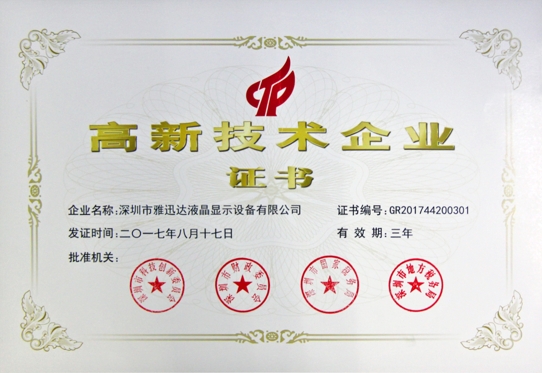 雅迅達又再度迎來好消息!深圳雅迅達液晶顯示有限公司通過國家認證的高新技術(shù)企業(yè)認證書,科學是發(fā)展的重要內(nèi)在推動力,高新技術(shù)企業(yè)是指在《國家重點支持的高新技術(shù)領(lǐng)域》內(nèi),持續(xù)進行研究開發(fā)與技術(shù)成果轉(zhuǎn)化,形成企業(yè)核心自主知識產(chǎn)權(quán),并以此為基礎(chǔ)開展經(jīng)營活動,在中國境內(nèi)(不包括港、澳、臺地區(qū))注冊一年以上的居民企業(yè)。它是知識密集、技術(shù)密集的經(jīng)濟實體。