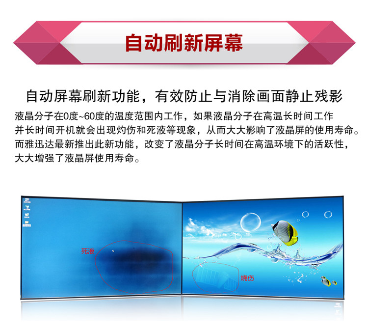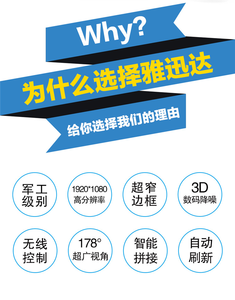 雅迅達(dá)一直秉承著“信達(dá)天下、普惠萬(wàn)家”為企業(yè)口號(hào),秉承“專(zhuān)業(yè)、專(zhuān)注、專(zhuān)一”的企業(yè)精神和“典雅、守信、惜時(shí)、抗挫、精業(yè)”的企業(yè)意志,堅(jiān)持“4C服務(wù)、合作共贏”為原則,做出用戶(hù)體驗(yàn)更好 性?xún)r(jià)比更佳的 液晶拼接產(chǎn)品,如需了解更多詳情請(qǐng)點(diǎn)擊深圳市雅迅達(dá)液晶顯示設(shè)備有限公司