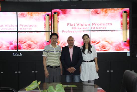 (Martin先生參觀工廠對(duì)我們最近即將推出的高清窄邊拼接墻)