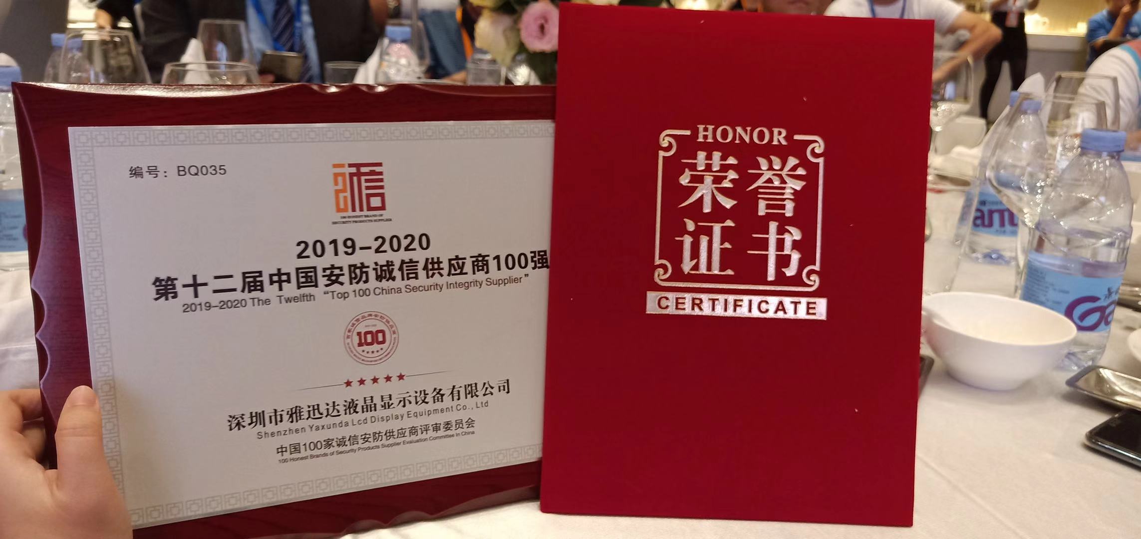 2019年10月27日,“第十二屆中國安防誠信供應(yīng)商100強”頒獎盛典在深圳威斯汀酒店成功舉行。深圳市雅迅達液晶顯示設(shè)備有限公司應(yīng)邀出席頒獎典禮,并憑借在安防行業(yè)的優(yōu)良口碑榮獲“2019-2020年度中國安防誠信供應(yīng)商100強”的殊榮。