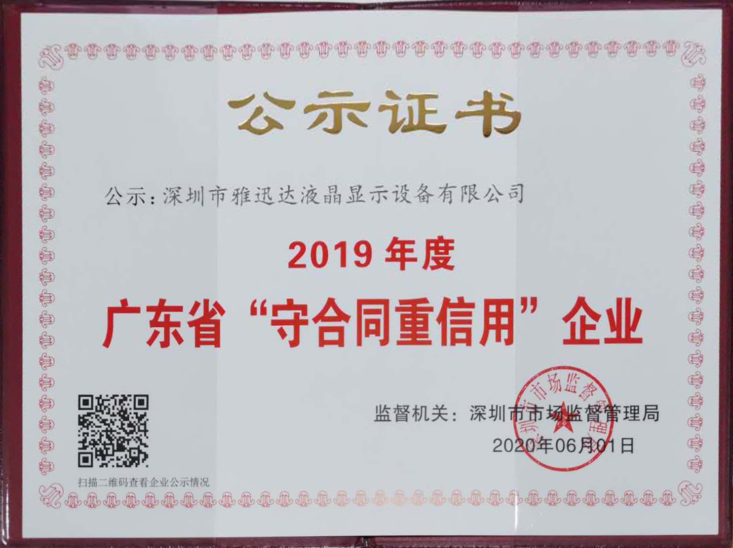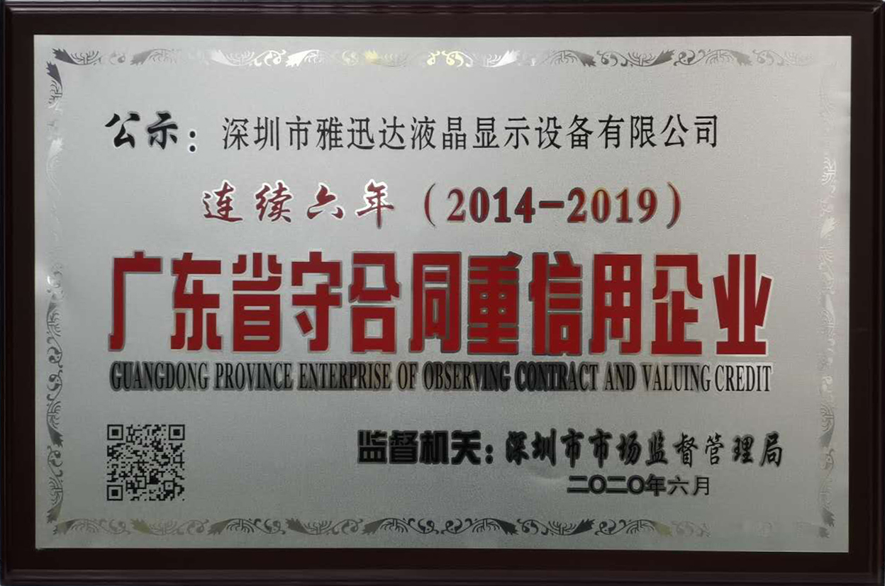 近日,經(jīng)廣東省深圳市市場監(jiān)督管理局審核批準(zhǔn),深圳市雅迅達(dá)液晶顯示設(shè)備有限公司獲得“守合同重信用企業(yè)”榮譽(yù)證書,這是雅迅達(dá)連續(xù)六年獲得該榮譽(yù),公司憑借長期積累沉淀的強(qiáng)勁實力和始終如一的卓越服務(wù),再次得到行業(yè)與社會的認(rèn)可,專注、專業(yè)的形象深入人心。
