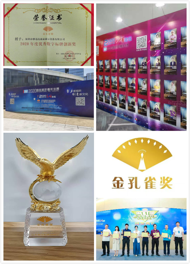 11月26-27日,2020視聽行業(yè)高峰論壇在深圳灣科技創(chuàng)新展示中心起航,通過線上+線下雙線融合的模式,總結(jié)了2020年視聽行業(yè)的沉浮,也探討了2021年視聽行業(yè)的規(guī)劃,同時(shí)對2020年視聽行業(yè)內(nèi)表現(xiàn)出色的企業(yè)給予肯定,頒發(fā)金孔雀獎!深圳市雅迅達(dá)液晶顯示設(shè)備有限公司再次斬獲數(shù)字標(biāo)牌行業(yè)金孔雀獎,實(shí)至名歸。