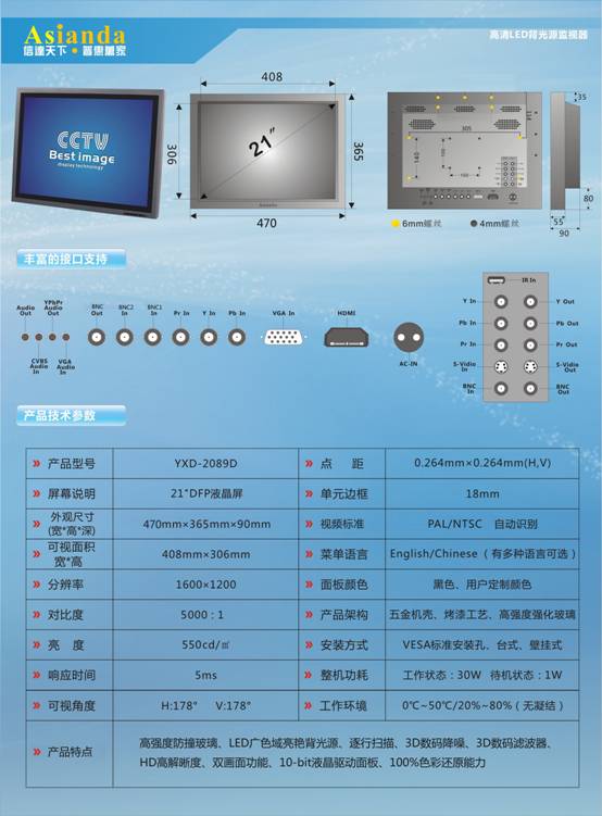 全球首臺(tái)LED背光源監(jiān)視器YXD-2089D系列同樣備受矚目,全新的LED背光源液晶監(jiān)視器配備了目前最高端HDMI接口,支持1080p逐行掃描,解決圖像閃爍的問題。動(dòng)態(tài)對比技術(shù)3D圖像處理,Qisk Mage魔術(shù)手軟件,保證了圖像的細(xì)膩平滑而不失真。超窄邊框設(shè)計(jì),滿足客戶不同工作環(huán)境的需求。為倡導(dǎo)此次夏季青年奧林匹克運(yùn)動(dòng)會(huì)的低碳環(huán)保概念,此款產(chǎn)品更在其環(huán)保低碳上下足了功夫,待機(jī)功耗≦1W,壽命超過了50000小時(shí),在節(jié)約能源的同時(shí)更加符合節(jié)能環(huán)保的時(shí)代潮流。
