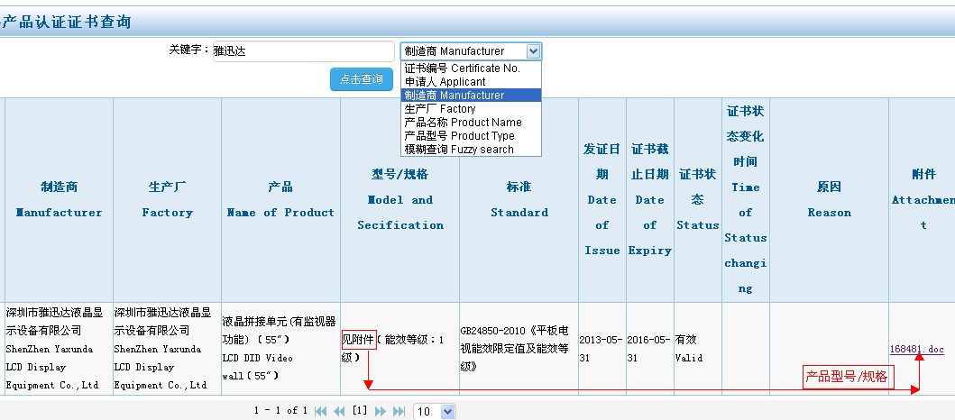 由于本次認證產品型號過多,不能通過產品型號直接查詢,客戶或工程商核對產品型號請通過證書編號、申請人、制造商、生產廠、產品型號等方式進行查詢,所有的產品型號見附件:168481.doc。如圖: