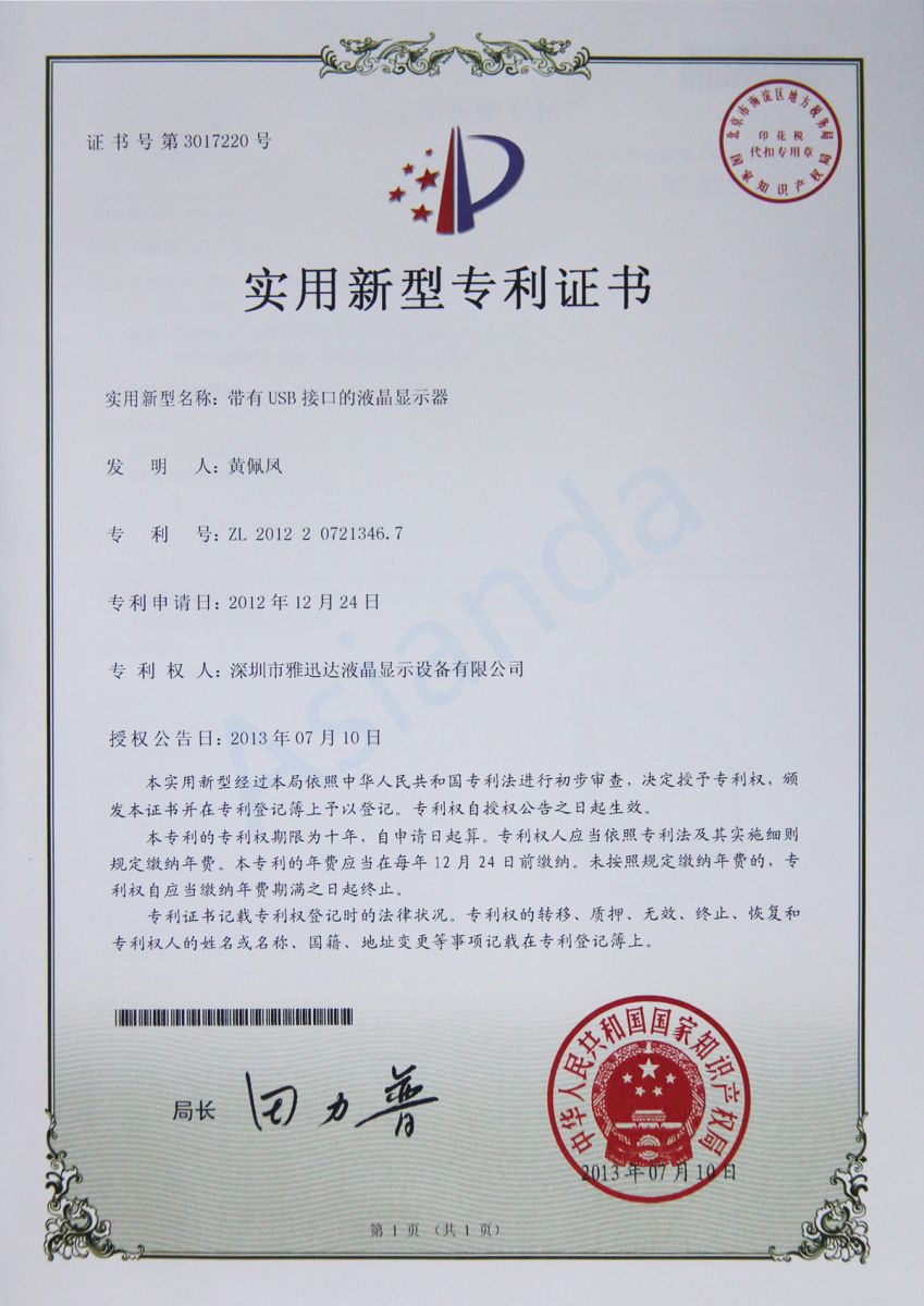 我公司“帶USB接口液晶顯示器”于2013年7月10日正式被國際知識產(chǎn)權(quán)局授權(quán)公告,榮獲實用新型專利證書,該專利是我公司在去年12月24日,向國家知識產(chǎn)權(quán)局提出“帶USB接口液晶顯示器”的專利申請。