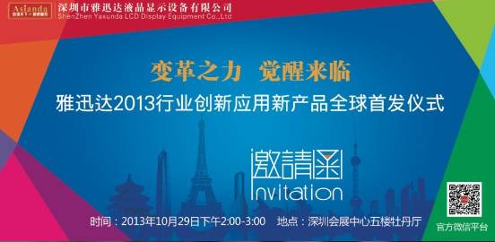 我們在行業(yè)化應(yīng)用方面的積極行動、豐富經(jīng)驗、完善的產(chǎn)品和解決方案體系,將再一次彰顯我們作為液晶顯示領(lǐng)域領(lǐng)先企業(yè)的能力和責(zé)任。在安防行業(yè)迅速發(fā)展的今天,唯有專業(yè)才能走得更遠(yuǎn),我們期待與您攜手,為行業(yè)創(chuàng)新應(yīng)用深入發(fā)展增添動力,共同推動商用高端顯示的“綠色化”進(jìn)程!“雅迅達(dá)2013行業(yè)創(chuàng)新應(yīng)用新產(chǎn)品全球首發(fā)儀式”,誠邀您拔冗出席!