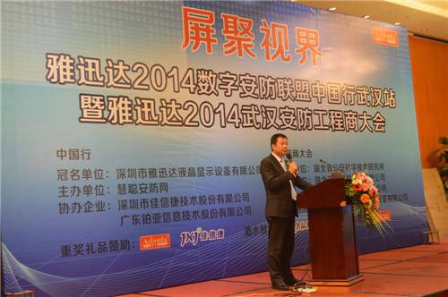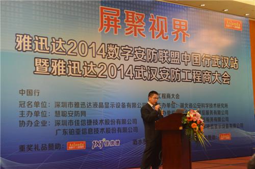 三月,正是江城櫻花盛開時節(jié)。3月24日,由深圳市雅迅達液晶顯示設(shè)備有限公司獨家冠名,慧聰安防網(wǎng)主辦,深圳市佳信捷技術(shù)股份有限公司、廣東鉑亞信息技術(shù)股份有限公司協(xié)辦,名品世家(北京)有限公司贊助的“屏聚視界——雅迅達2014數(shù)字安防聯(lián)盟中國行”,以及由深圳市雅迅達液晶顯示設(shè)備有限公司獨家冠名,湖北省公安科學(xué)技術(shù)研究院主辦,湖北萬澤展覽服務(wù)有限公司、北京四星展覽服務(wù)有限公司協(xié)辦的“2014武漢安防工程商大會”在武漢洪廣大酒店三樓宴會廳隆重舉行。