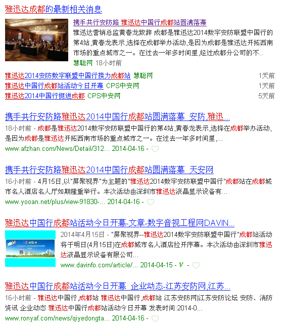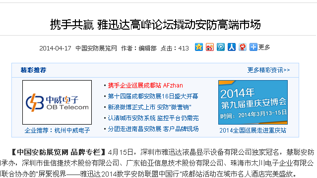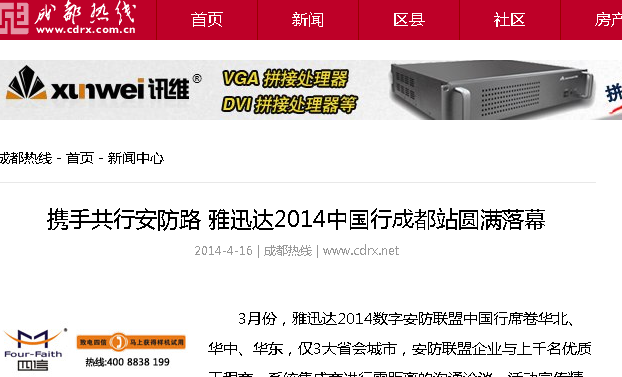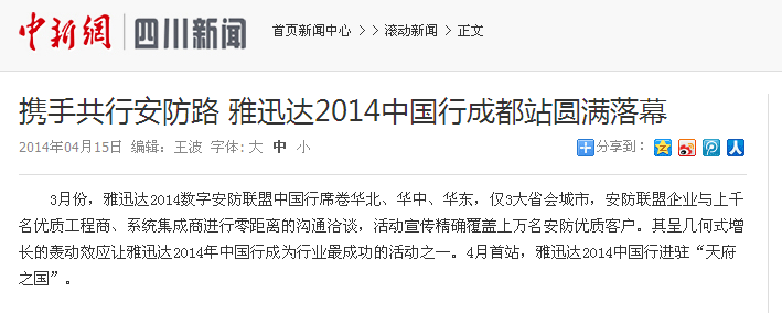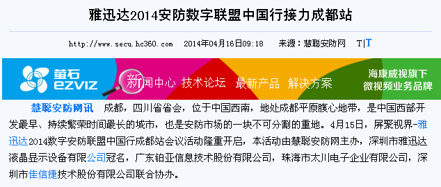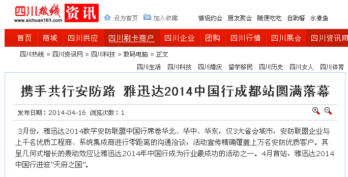 雅迅達中國行成都站活動與成都2014安防展會同期舉行,在西南安防市場形成規(guī)模效應(yīng),成都當(dāng)?shù)孛襟w予以關(guān)注。報道中,眾媒體紛紛對雅迅達發(fā)布的新技術(shù)和展品展示極大興趣。