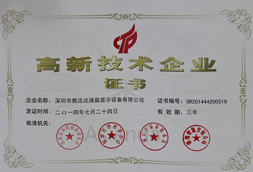 近日,深圳市雅迅達(dá)液晶顯示設(shè)備有限公司收到深圳市科學(xué)技術(shù)廳、深圳市財(cái)政廳、深圳市國(guó)家稅務(wù)局、深圳市地方稅務(wù)局聯(lián)合頒發(fā)的《高新技術(shù)企業(yè)證書》,該公司順利通過(guò)高新技術(shù)企業(yè)認(rèn)定,在我國(guó)液晶顯示產(chǎn)品領(lǐng)域又增加一家高新企業(yè)。