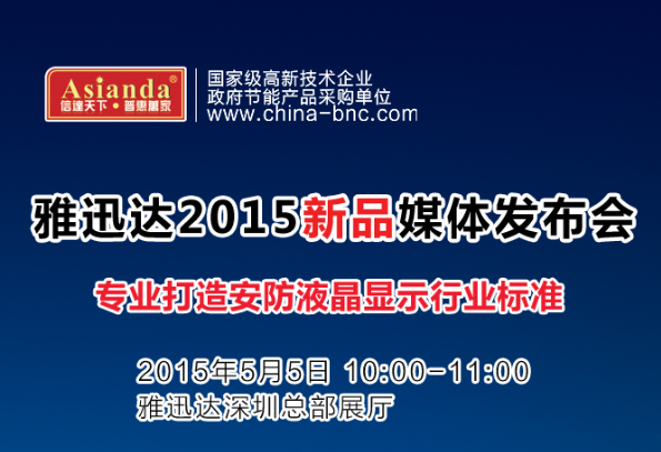 我公司研發(fā)的產品如第三代、第四代智能液晶拼接屏、高清液晶監(jiān)視器等系列新產品經過市場發(fā)酵期之后,已經得到了各行業(yè)面的一致認可。5月5日,雅迅達2015年首場新品媒體發(fā)布會將隆重舉行,在公司總部深圳召開“2015年新品發(fā)布會暨媒體見面會”。