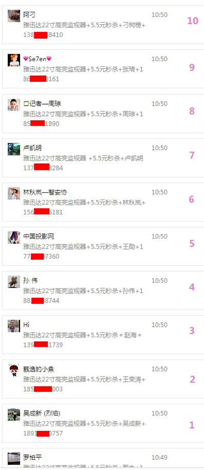 北京時間2015年5月5日10:50分,雅迅達2015新產(chǎn)品媒體發(fā)布會現(xiàn)場5.5元新產(chǎn)品微信秒殺活動順利舉行。首先感謝各位用戶的積極參與,活動中獎名單如下所示:
