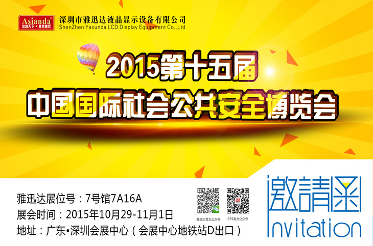 2015年10月29日,第十五屆中國國際社會(huì)公共安全博覽會(huì)(2015深圳安博會(huì))將隆重開幕。此次展會(huì)作為兩年一度的安防盛宴,雅迅達(dá)應(yīng)邀參加,并將展示公司近期研發(fā)的產(chǎn)品及新技術(shù),其中有行業(yè)創(chuàng)新產(chǎn)品:AHD監(jiān)視器YXD-B228HD-A。雅迅達(dá)展位號(hào):7號(hào)館7A16A。