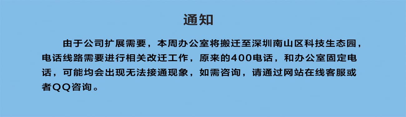 關(guān)于公司搬遷的通知 由于公司擴展需要,本周辦公室將搬遷至深圳南山區(qū)科技生態(tài)園,電話線路需要進行相關(guān)改遷工作,原來的400電話,和辦公室固定電話,可能均會出現(xiàn)無法接通現(xiàn)象,如需咨詢,請通過網(wǎng)站...