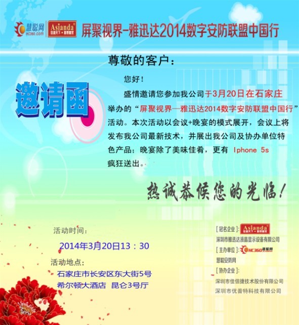 雅迅達(dá)2014數(shù)字安防聯(lián)盟中國(guó)行石家莊站客戶邀請(qǐng)函發(fā)出 距離“屏聚視界——雅迅達(dá)2014數(shù)字安防聯(lián)盟中國(guó)行”首站——石家莊站的活動(dòng)開幕還有半個(gè)月,雅迅達(dá)客戶邀請(qǐng)工作緊鑼密鼓的展開。繼上周的電話邀約之后,電子邀請(qǐng)函和短信邀請(qǐng)及時(shí)...