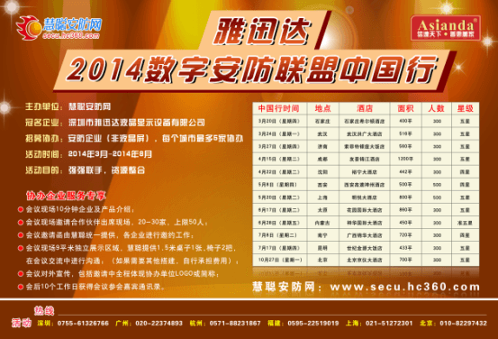 逐鹿中原 雅迅達(dá)冠名2014中西部IT產(chǎn)品博覽會 在繼獨(dú)家冠名“雅迅達(dá)2014數(shù)字安防聯(lián)盟中國行”大型活動后,近日,深圳市雅迅達(dá)液晶顯示設(shè)備有限公司在品牌建設(shè)上再度重磅出擊,攜手安防行業(yè)權(quán)威媒體慧聰安防網(wǎng),以及河南IT市場最...